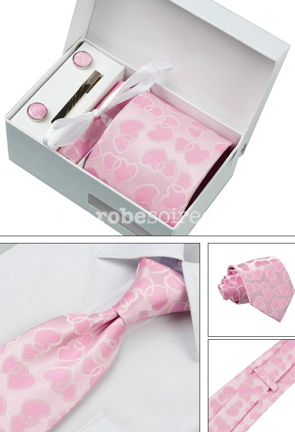 Ce coffret contient une cravate, une pochette de couleur assortie, une pince à cravate et une paire de boutons de manchette également assortis.