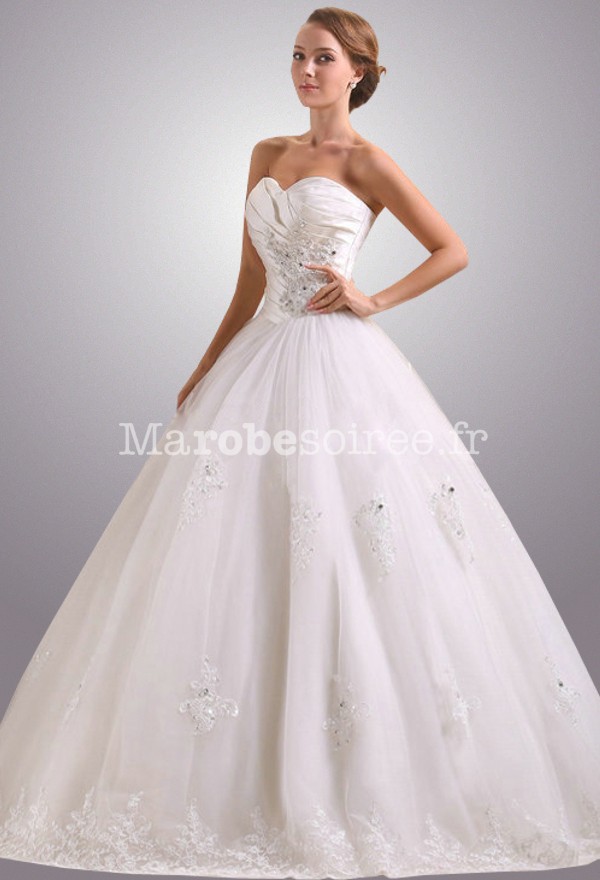 Cette robe de mariée a une forme en trapèze, ce qui lui donne son caractère de "robe de princesse" et souligne la taille de guêpe de la mariée.