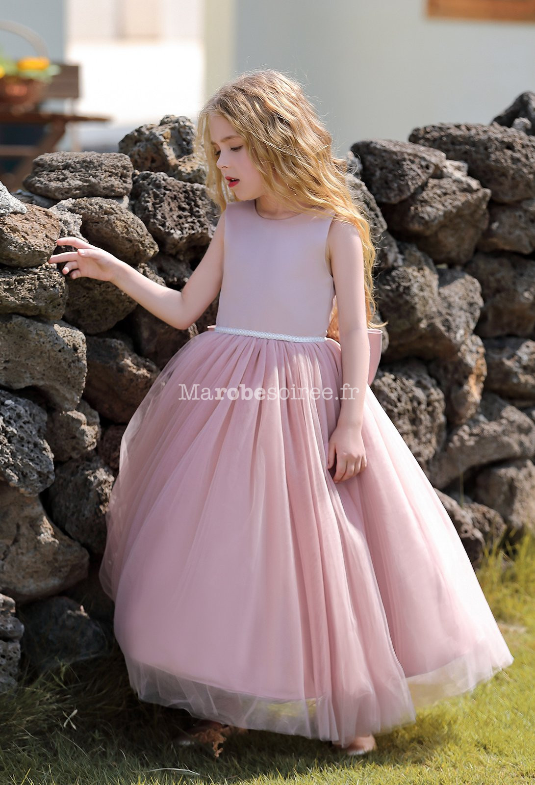 Jolie robe enfant longue avec le haut en satin et jupe vaporeuse en tulle.